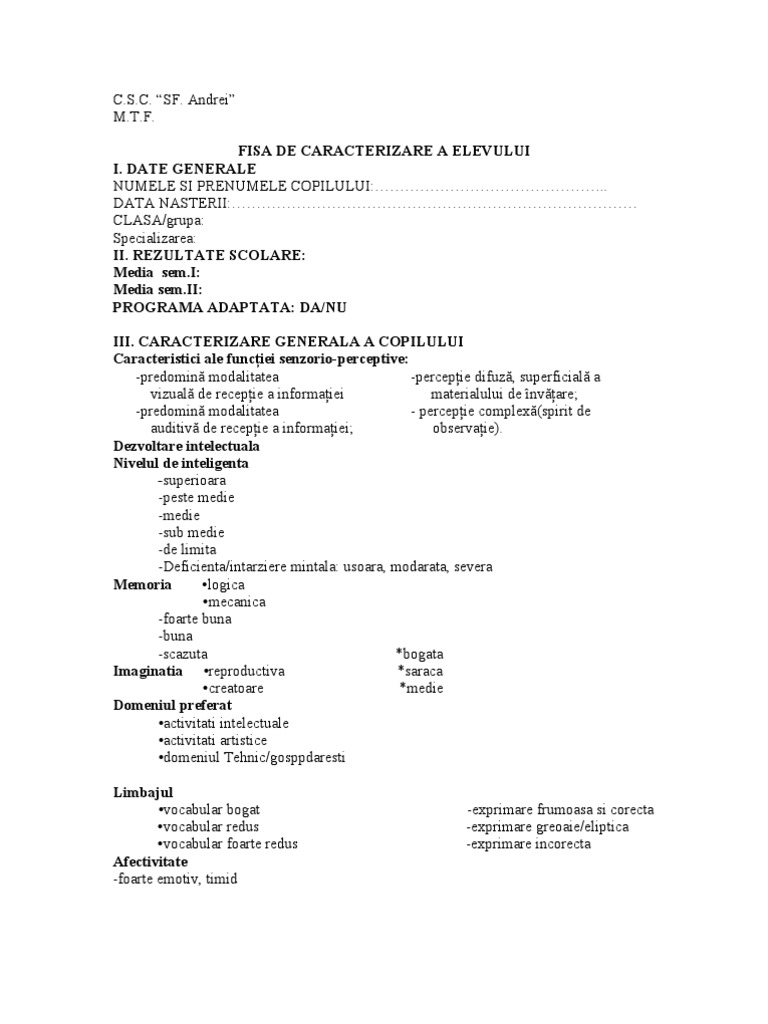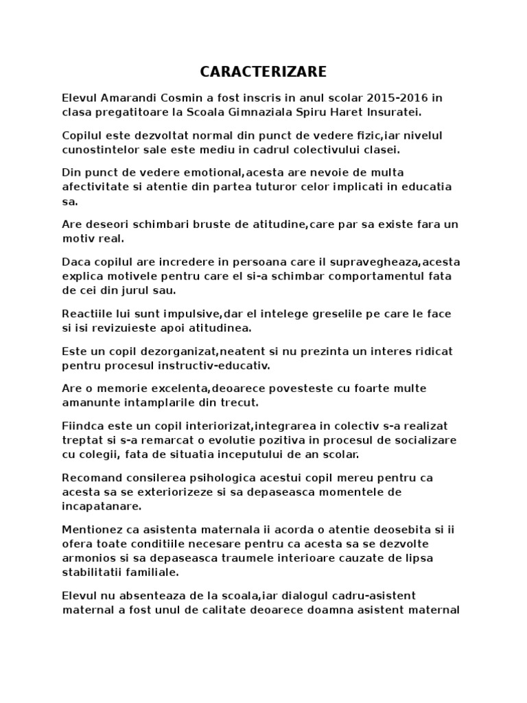 Caracterizare Psihopedagogică Model Model