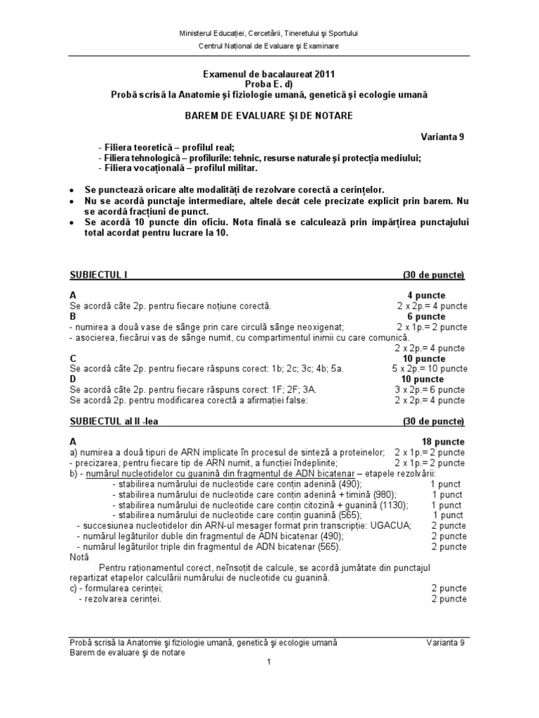 Barem De Corectare Bac 2011 Anatomie Si Fiziologie Umană Genetică Si Ecologie Umană